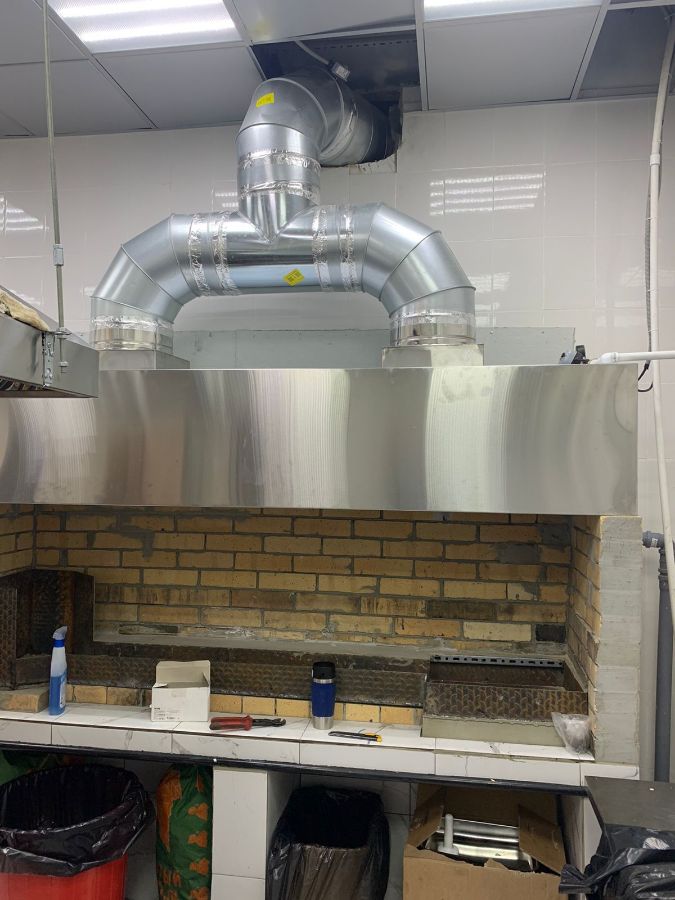 Семь вытяжных островных зонтов с жироулавливающими фильтрами для сети кофеен за 7 дней! Нержавеющая сталь AISI 430х1,0 мм, врезки, ушки крепления.